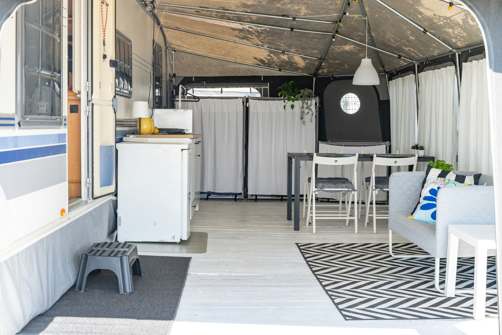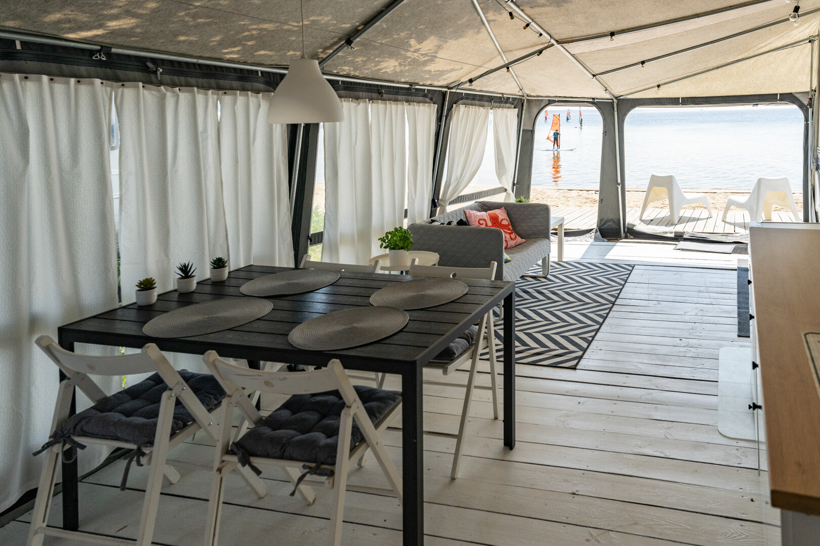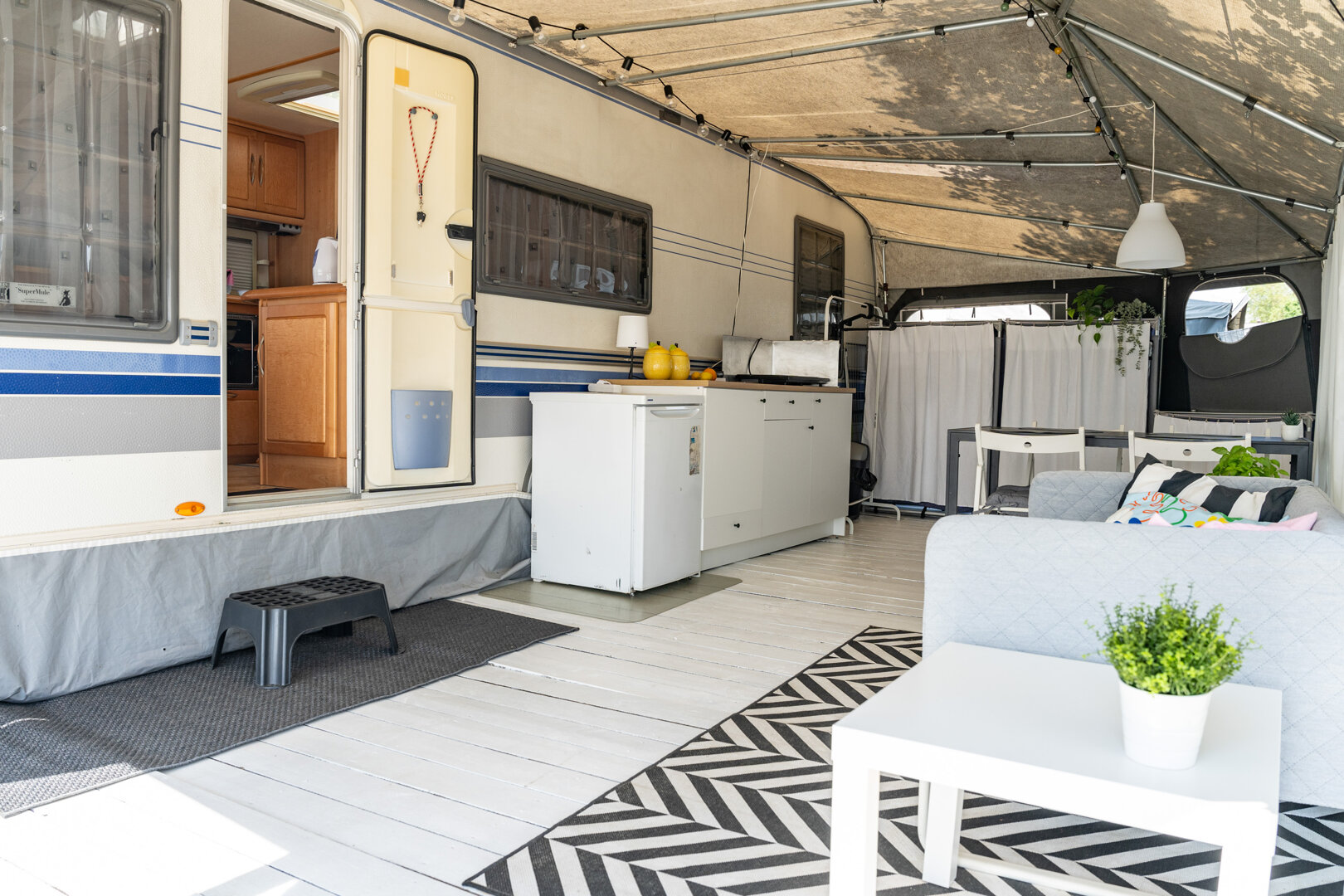Do przyczepy przynależy przestronny, zadaszony przedsionek, który pełni rolę letniego salonu i kuchni. Znajdziesz tu w pełni wyposażony aneks kuchenny (z kuchenką elektryczną, lodówką, czajnikiem, kompletem naczyń i przyborów kuchennych) oraz stół z krzesłami, idealny do wspólnych posiłków lub wieczornego relaksu po dniu pełnym aktywności.
